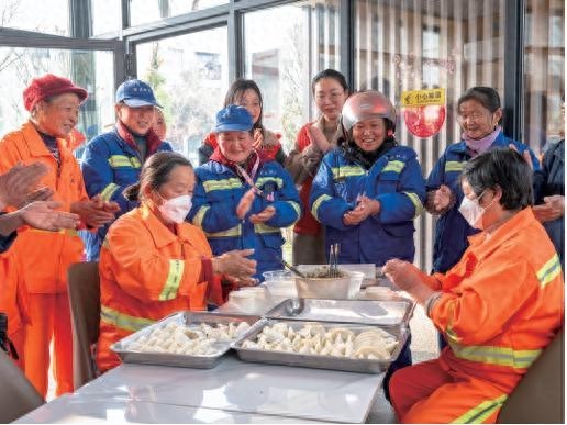 1月23日,安徽省芜湖市繁昌区城市管理局党组织和工会组织志愿者走进繁阳镇城北公园人民城市驿站,和环卫工人一起开展迎新春活动。活动现场,在志愿者的组织下,环卫工人先后参加了包饺子、夹豆子等比赛,在欢声笑语中迎接新春佳节。中新社发 肖本祥摄