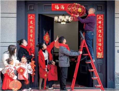 1月22日,浙江省湖州市长兴县夹浦镇北川村,喜迁新居的村民刘焕永和家人一起贴春联、挂灯笼、布置新家。人民视觉