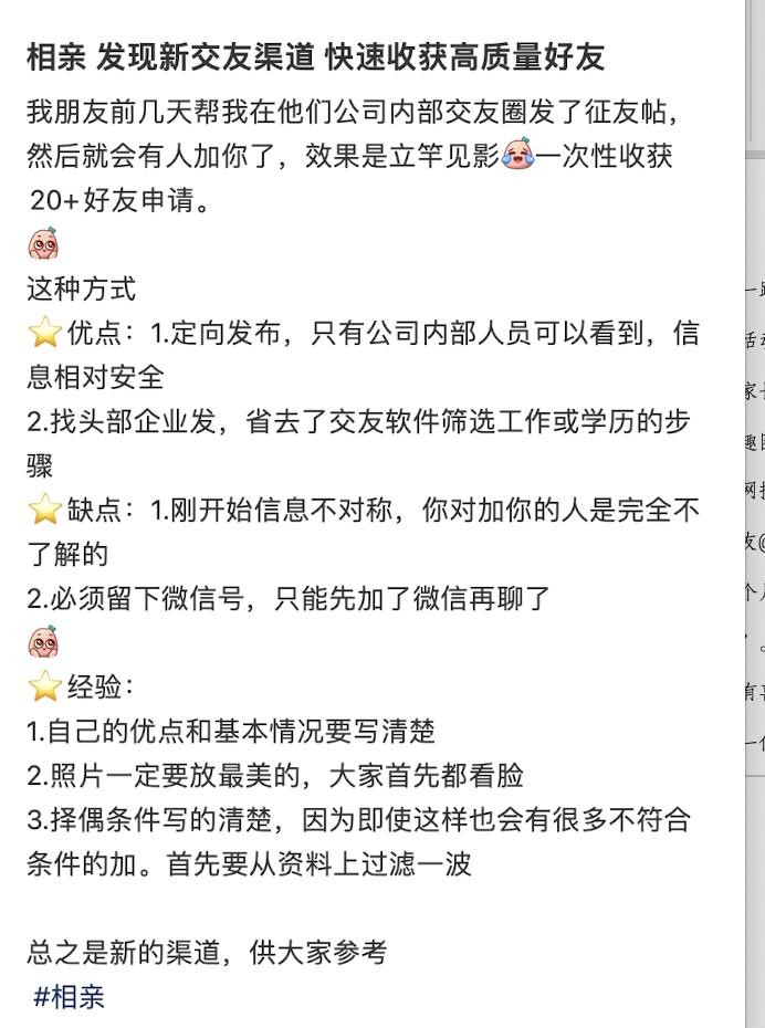 讲究效率的年轻人还探索出了快速匹配好友的渠道。网友@momo想找个互联网行业高薪、学历不错、务实的对象,为此几个月前就找到在大厂工作的亲戚帮忙在内网发布征婚贴,最终“许愿成功”。