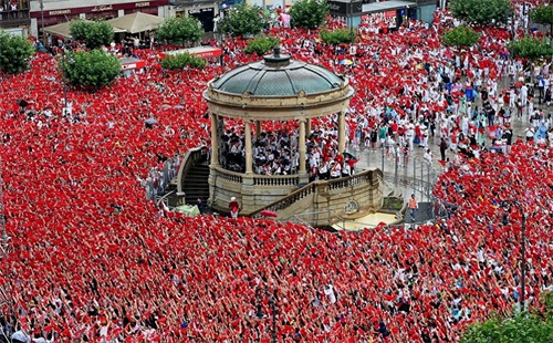 在7月13日,奔牛活动再次举行,吸引着大批游客和观众。人们站在街道两侧,等待着公牛的到来,然后挑战自己的勇气,与公牛一同奔跑。这一刻充满了刺激和冒险,也成为了奔牛节不可或缺的一部分。