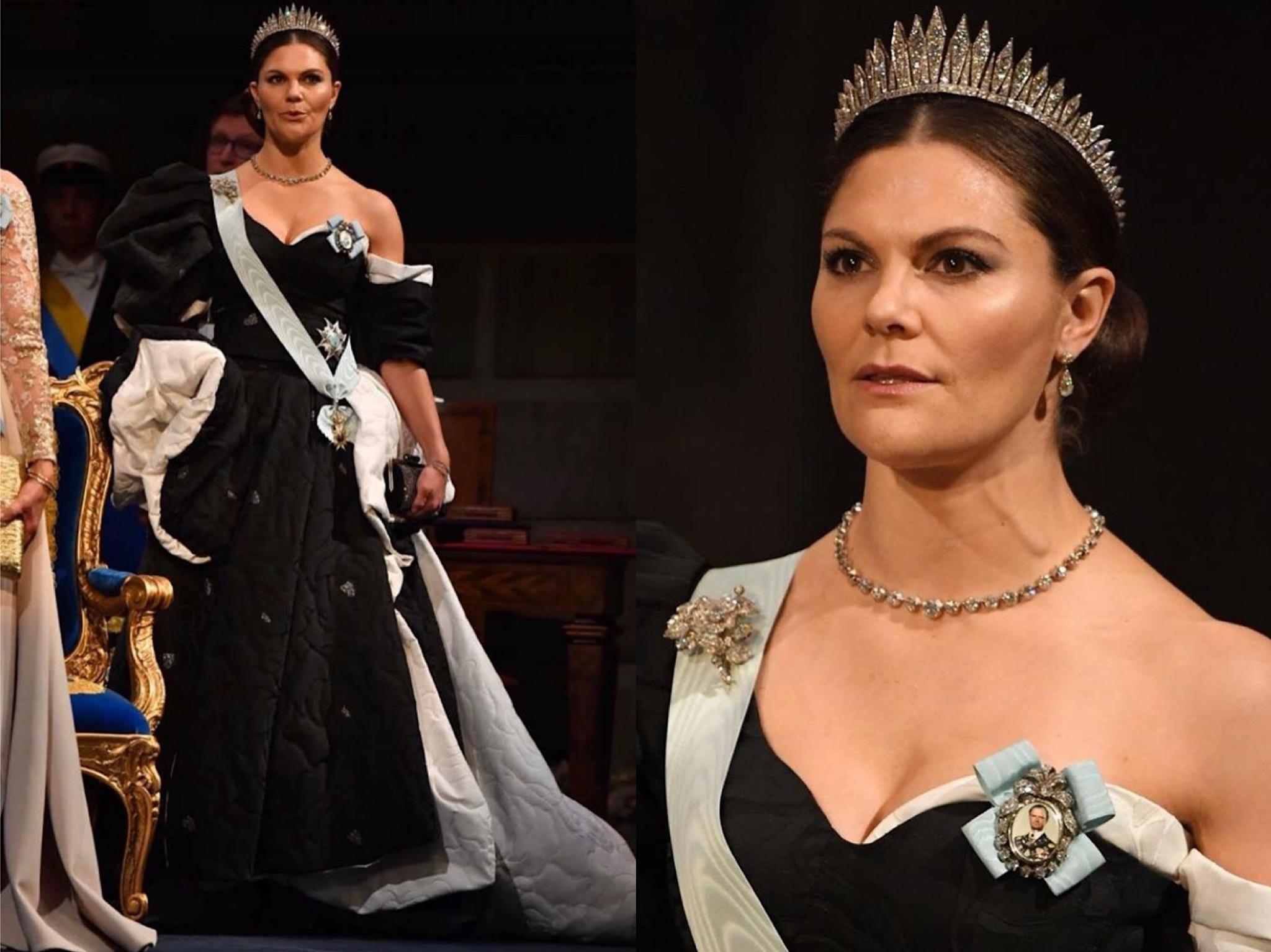 女王储维多利亚选择了典雅的黑白色系高定礼服,精致的王冠和项链熠熠生辉,她身材比例不是特别优越,但气势显得特别足,不愧是以后瑞典王室的接班人。