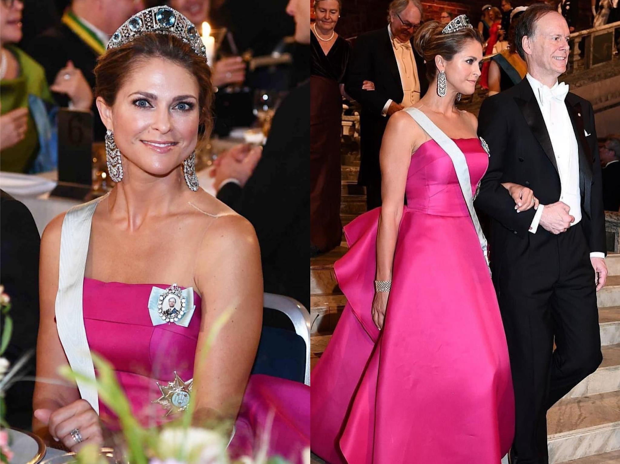 2019年诺贝尔奖颁奖晚宴上,瑞典王室成员都出席了,其中最引人注目的就是女王储维多利亚、玛德琳公主、索菲亚王妃三人,可以看出关系相处得相当融洽。三人同样选择绸缎高定礼服,绚丽的色彩和头戴王冠的模样有些童话风。
