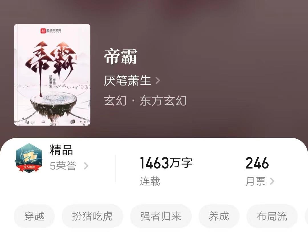 如果喜欢爽文,装b打脸文的书友真的要去看这本,不过,确实是更新太多了,我自己是追不下去了,前面写得真不错,挺吸引人,但是后面就套路化了,装b打脸,然后换一界,继续装b打脸。不知道有没有大佬还在追这本书,可以在评论区留言,让我瞻仰一下是哪位大佬道心如此坚定。