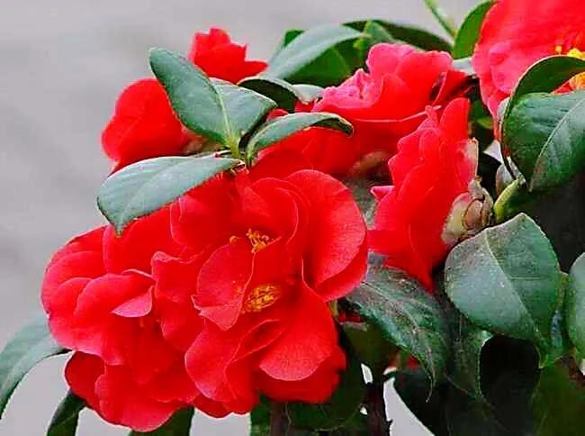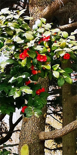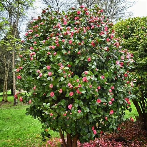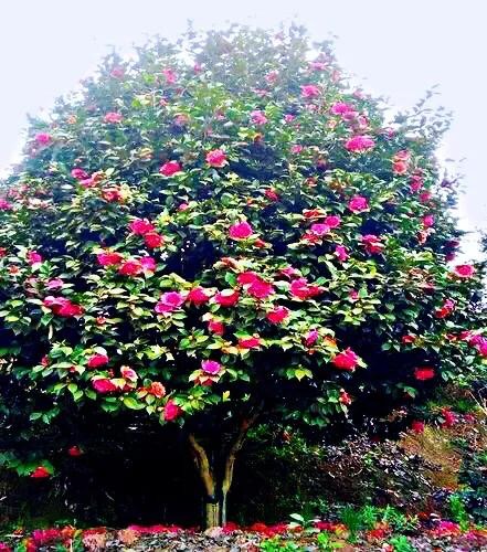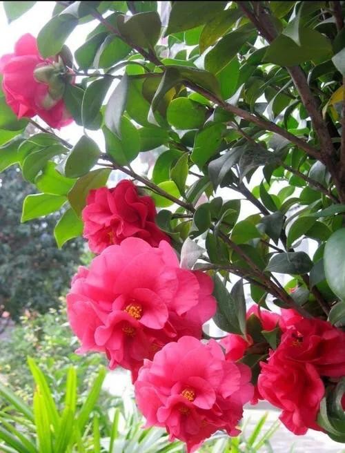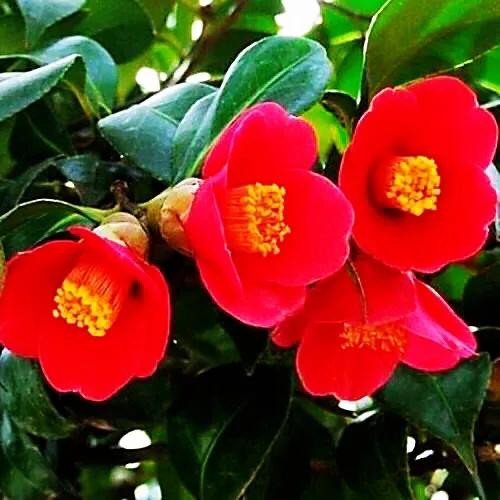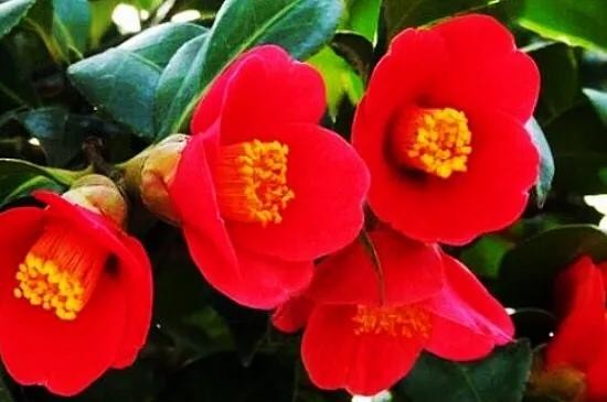 耐冬,树姿优美,树叶浓茂,四季常青,花色鲜艳,叶色葱绿,叶形秀丽,于瑞雪飞舞的冬天开花,花开时花瓣鲜红欲滴,花蕊嫩黄骄人,花期长达半年。
