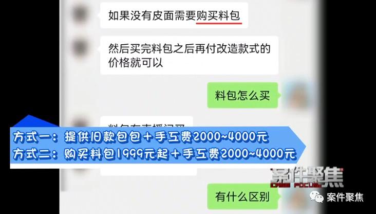 一种是顾客自行提供旧款包包作为料包,商家根据客户要求制作新款,收取 2000-4000 元不等的加工费。