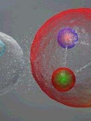 由三个夸克组合成的粒子称为“重子”,质子和中子就是重子。每个重子都是由3 个夸克组成,同时每一个夸克都各具有一种颜色。当三个夸克组合在一起时,红、绿、蓝相互抵消,变成“无色”,色荷守恒,于是他们就结合在一起了。