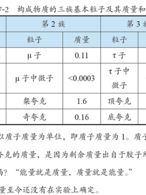 构成物质的基本粒子如表17-2 所示,共分为三族,每一族包括2 个夸克和2 个轻子。三族中同一行相应的粒子除了质量依次增大而不同外,性质完全站电一样。其中,第1 族为物质世界的基本组成;第2 族除中微子外极不稳定,它们所构筑的各种粒子很快就会发生衰变磁力计;第3 族也是如此。