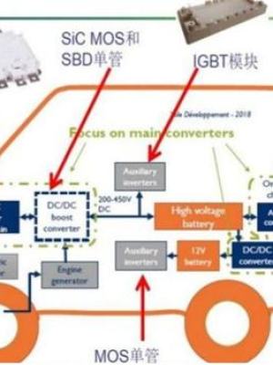 新能源汽车系统架构中涉及到功率半导体应用的组件包括:电机驱动系统、车载充电系统(OBC)、电源转换系统(车载 DC/DC)和非车载充电桩。碳化硅功率器件应用于电机驱动系统中的主逆变器,能够显著降低电力电子系碳化统的体积、重量和成本,提高功率密度。