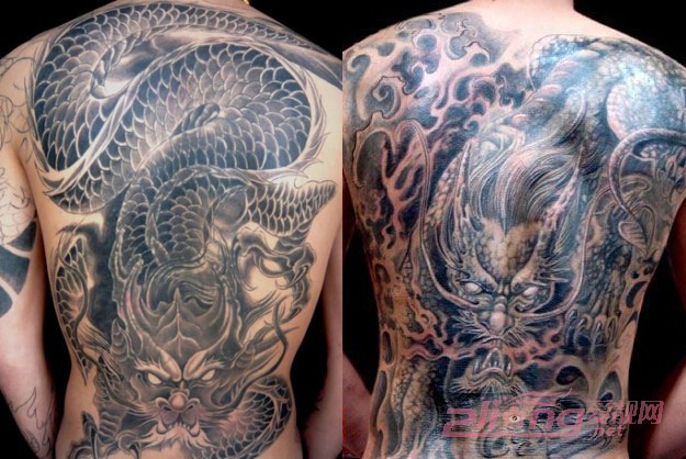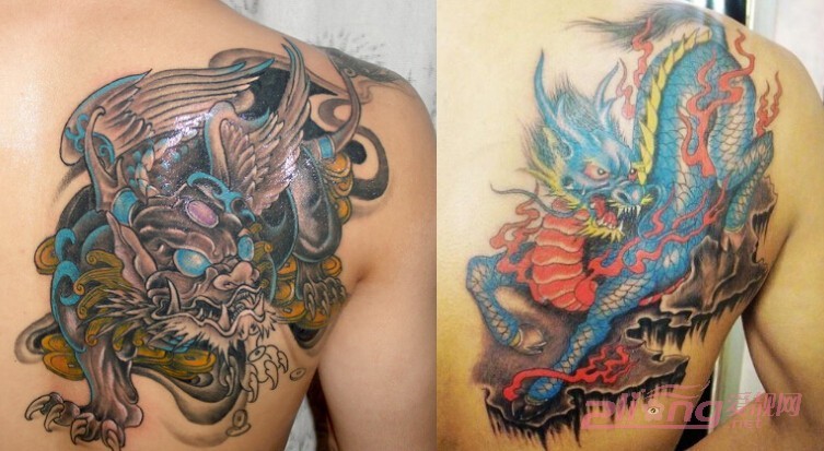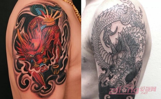 这两款麒麟纹身最大的共同特点就是,着重了对麒麟尾巴的雕刻。麟甲横生的细微特点让纹身师傅精心地描绘在背部和臂弯处,让人更想一探究竟,不舍得移开目光。